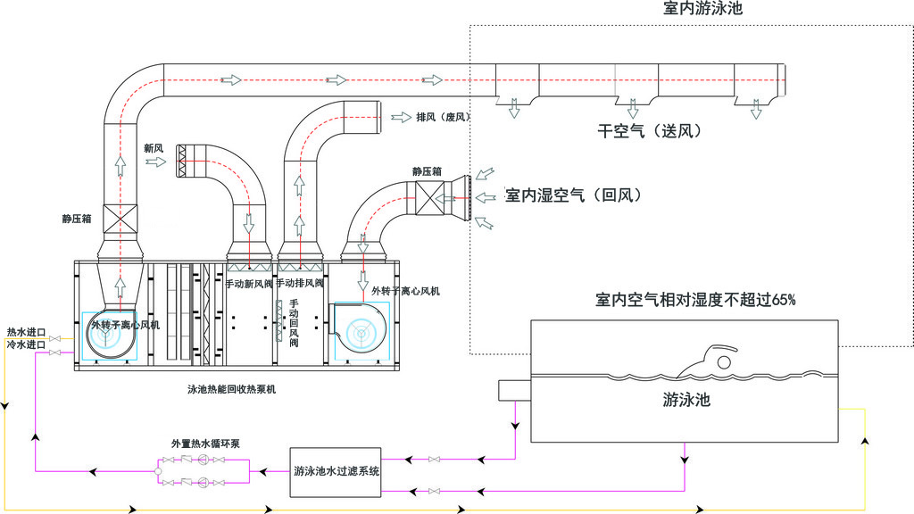 • 泳池熱泵熱水機組,通過輸入少量電能、吸收環境中大量熱能,制熱成本不到鍋爐、燃爐、電熱的一半,從而體現更節能、環保、安全。